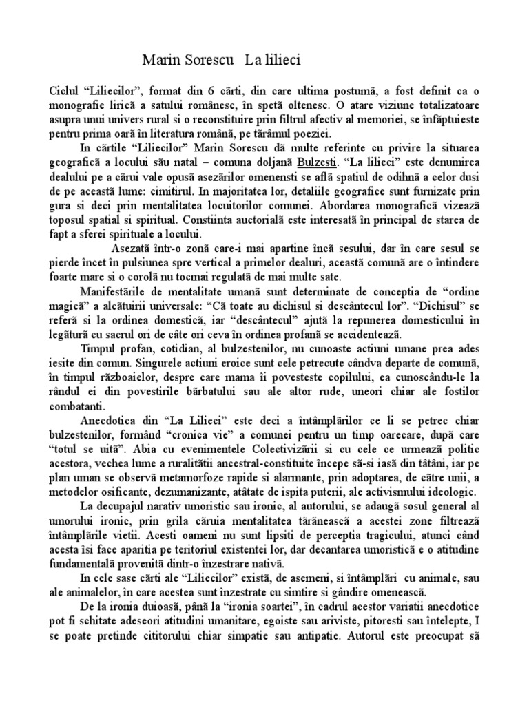 vizitati articolul complet aici : https://www.ceeol.com/search/article-detail?id=105570 „la lilieci este, de fapt, numele cimitirului satesc al bulzestilor: La lilieci (iii) * prefaţă de ion pop jurnalul j. Coexistă în lumea satului sorescian din la lilieci două sisteme de denominaġie.