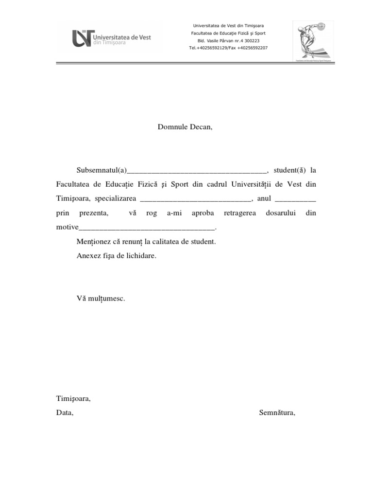 vizitati articolul complet aici : https://www.uauim.ro/universitatea/regulamente/ Pe baza ordonanţei de urgenţă nr. Model cerere adeverinta pentru casa de pensii model cerere adeverinta student m odel cerere intrerupere studii m odel cerere reinmatriculare m odel cerere repetare an m odel cerere retragere de la studii model cerere situatie scolara m odel cerere supliment la diploma. Model cerere retragere din concurs.