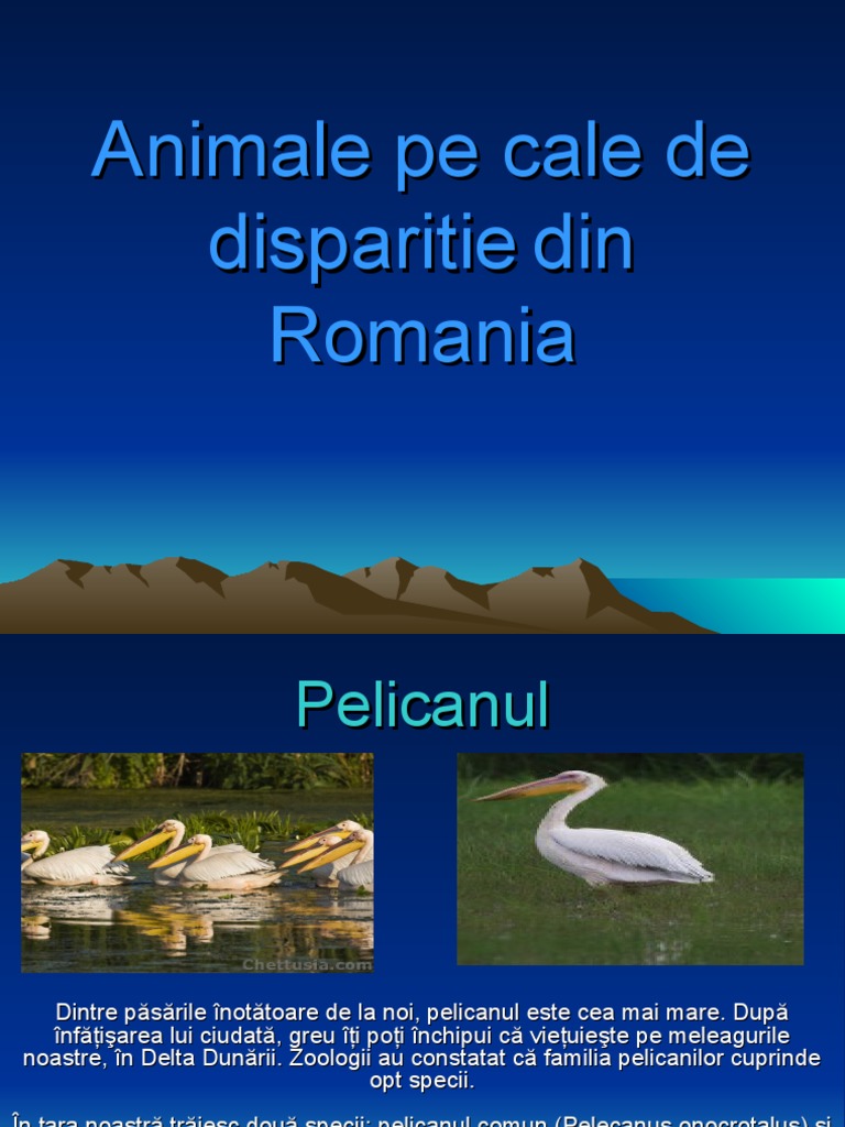 vizitati articolul complet aici : https://baby.unica.ro/animale-pe-cale-de-disparitie-2236421.html Lista de specii de plante si animale recunoscute ca fiind pe cale de disparitie este destul de mare. Suprafata carpatilor din romania constituie habitatul a 40% dintre lupii europeni (3000 lupi), 60% dintre ursi (aproximativ 5600 ursi bruni) si 40% dintre risi (1500 rasi). Calatorie virtuala printre obiectivele turistice din romania.
