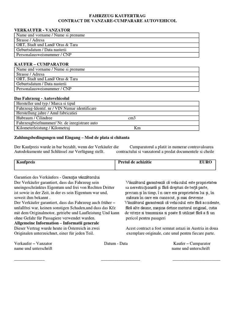 În contract va trebui să apară numele complet al vânzătorului, dar și al cumpărătorului, și să se specifice că prezentul contract a fost întocmit pentru vânzarea unui automobil.
